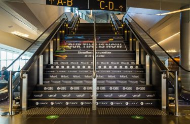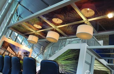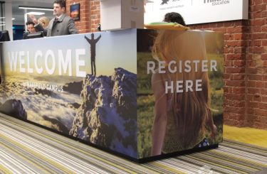 Our printers are capable of printing on a vast number of materials, and we can put a sign almost anywhere, from a traditional sign on the wall to a wraparound for the front desk to decorative advertisements on the stairs.